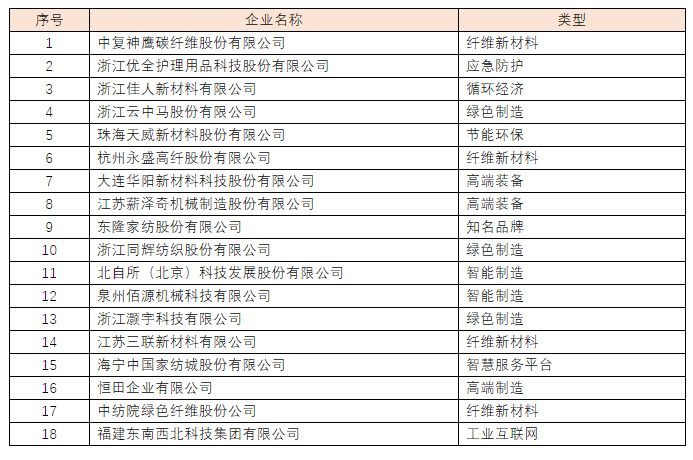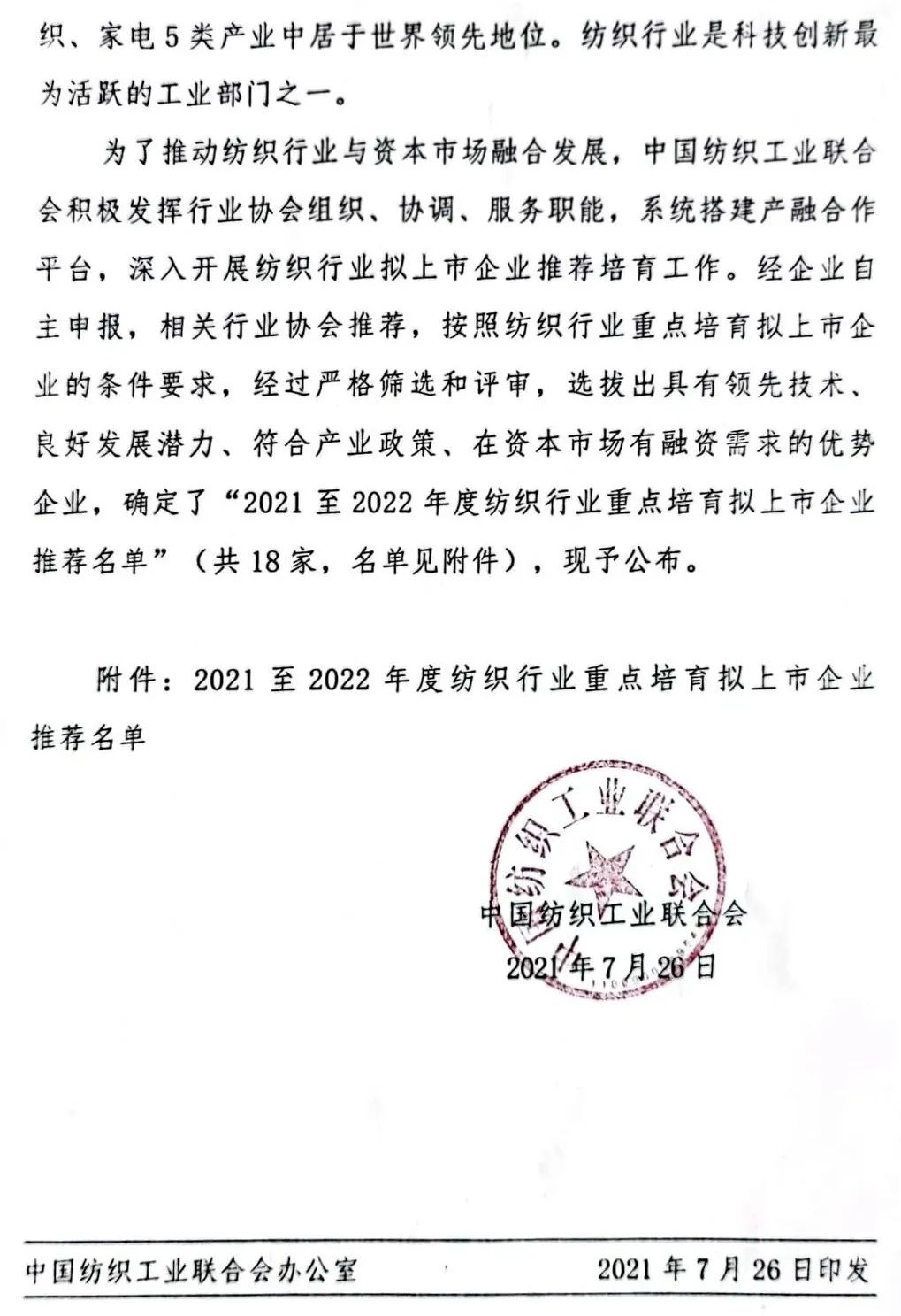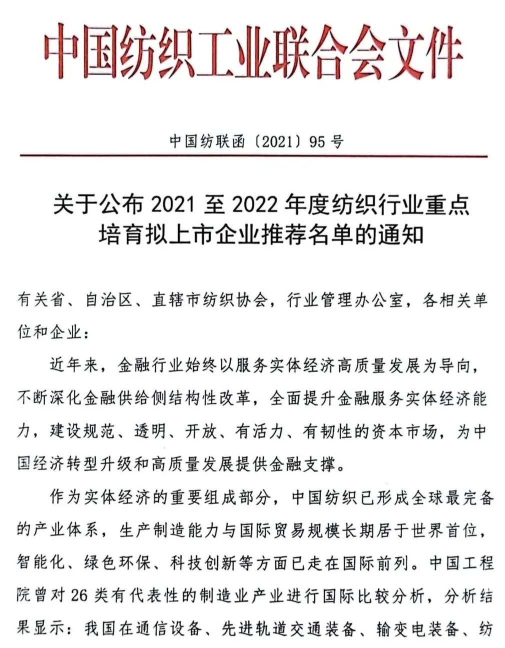 Under det första året av den 14:e femårsplanen påskyndar China Textile Industry Federation integrationen av textilindustrin och kapitalmarknaden. Den 26 juli utfärdade China Textile Industry Federation tillkännagivandet om att publicera den rekommenderade listan över nyckelföretag som ska listas i textilindustrin från 2021 till 2022. Efter strikt screening och utvärdering, 18 fördelaktiga företag med ledande teknologi, god utvecklingspotential, i linje med industripolitik och finansieringsbehov på kapitalmarknaden valdes ut för att bilda en rekommendationslista. Dessa företag involverar nya fibermaterial, intelligent tillverkning, modekonstruktion, grön tillverkning, avancerad industriell textil och andra områden, som också är nyckelområdena som stöds av textilens "14:e femårsplan".